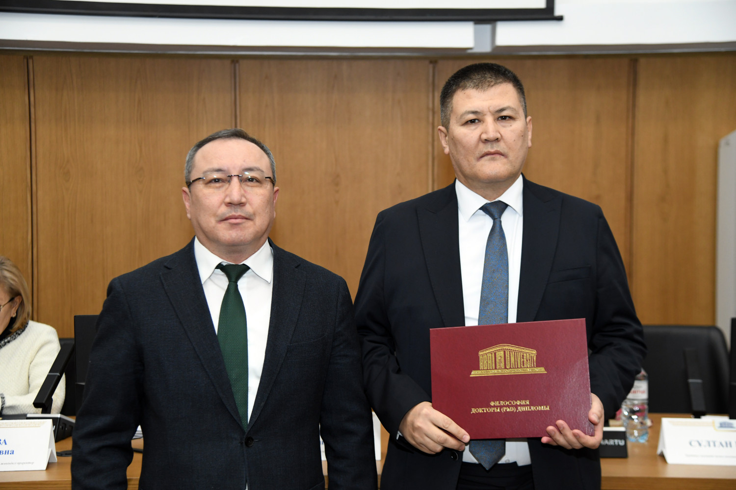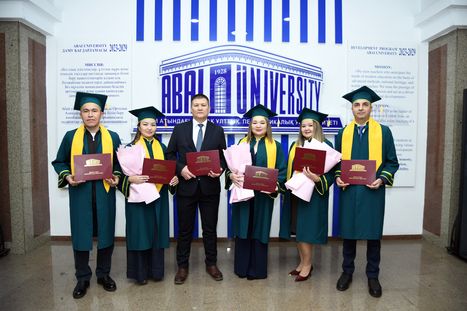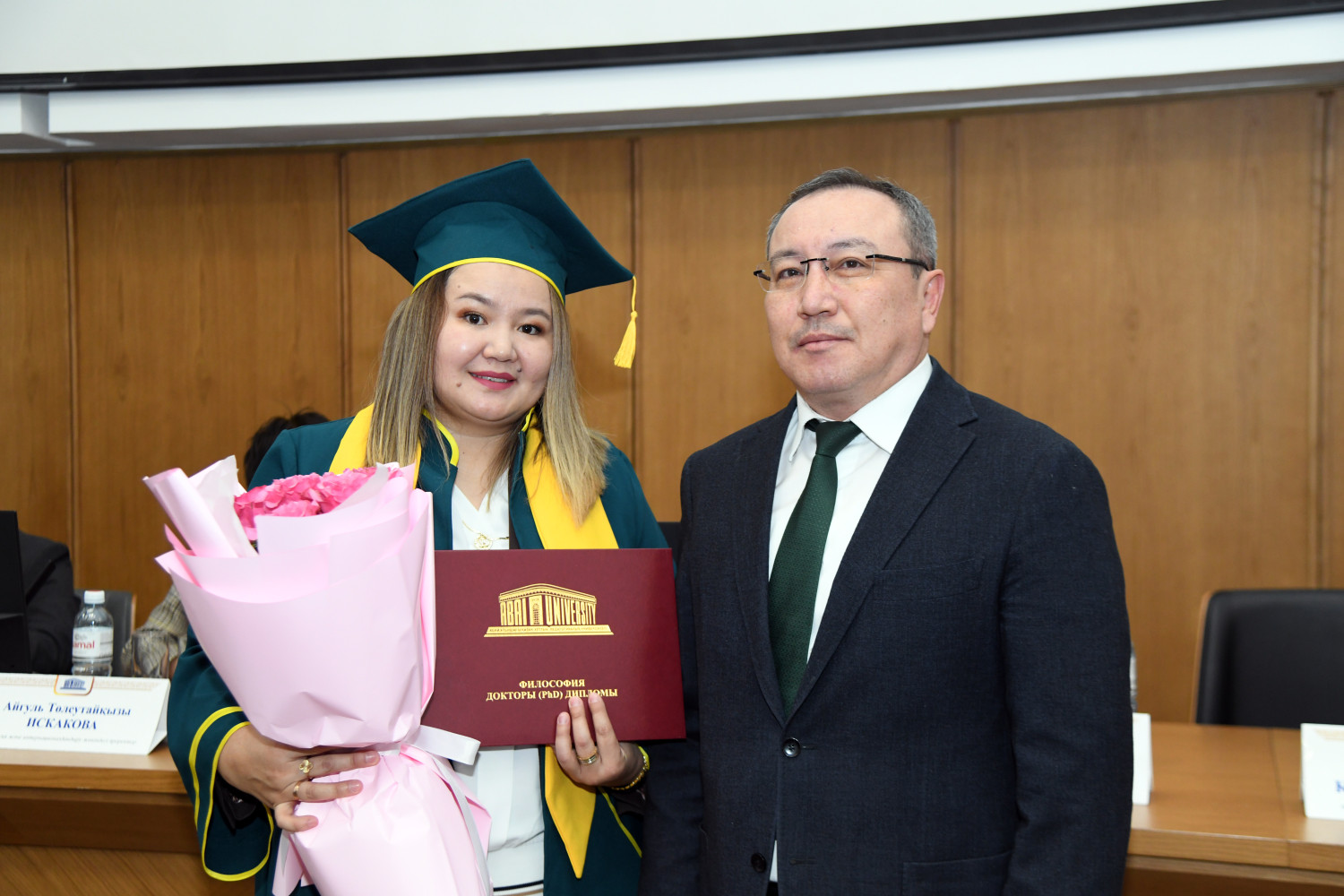At the meeting of the Academic Council, young scientists who received PhD degrees in a number of educational programs were solemnly awarded. In particular, Baykhozhayeva Gulzhaukhar Mazhitovna ("Biology"), Aryn Yerzhan Omaruly ("Linguistics"), Musakhan Ryskul Myrzakhankyzy ("Geography"), Khorgasbai Enlik Tokhpolatkyzy ("Geography"), Nabiyev Vakil Huseynovich ("Political Science") and Yusupov Kuanyshbek Yesenbekovich ("Sociology") were awarded a PhD, Bulat Anapiyevich officially congratulated them.